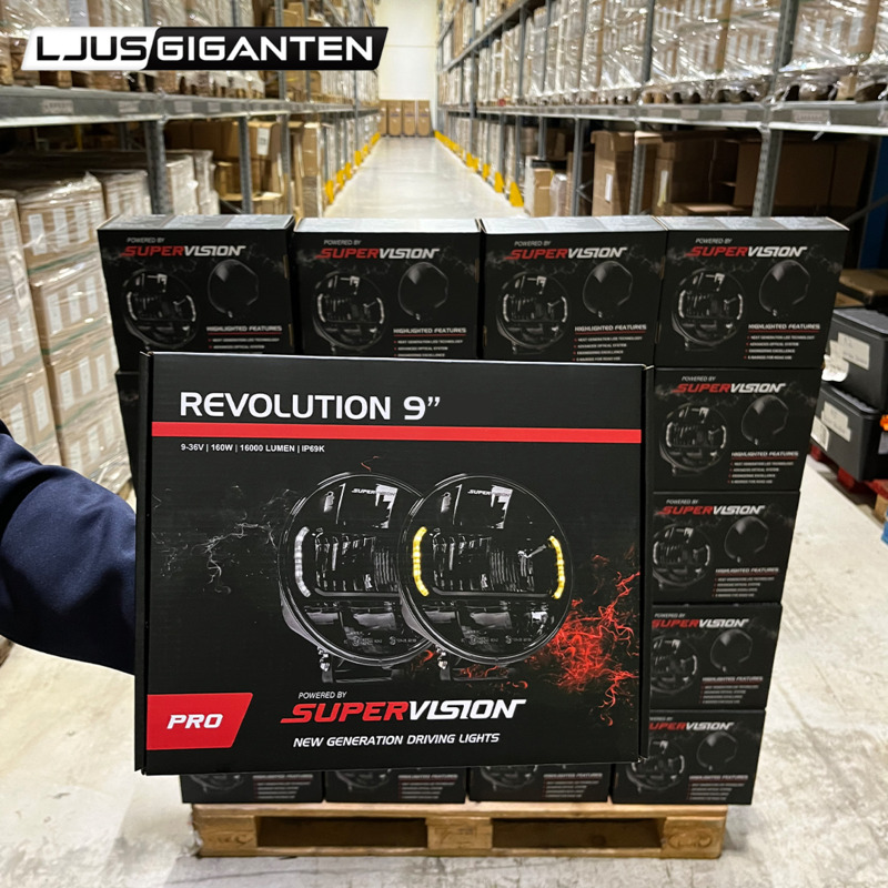 Valaisimen ulkonäkö sulautuu auton etuosaan sen tummien, kauttaaltaan sävytettyjen heijastimien ansiosta. Revolution 9" PRO kehityksessä on keskitytty kevytrakenteiseen suunnitteluun, ja valaisin painaa vain 1,8 kg, mikä on saavutettu valitsemalla kaikki materiaalit erittäin huolellisesti. Valaisimen parkkivalo on hienosäädetty välttämään yleisesti esiintyvää karkeaa valoa, josta monet parkkivalot kärsivät. Revolution sopii erinomaisesti henkilöautoihin, pakettiautoihin ja kuorma-autoihin. Kuten muutkin Supervision-sarjan valaisimet, Revolution on varustettu maailman johtavan amerikkalaisen Cree-yhtiön huippulaadukkailla (BIN) LED-diodeilla. Huippuluokan Cree-diodit yhdistettynä uraauurtavaan peilioptiikkaan nostavat suorituskyvyn aivan uudelle tasolle.